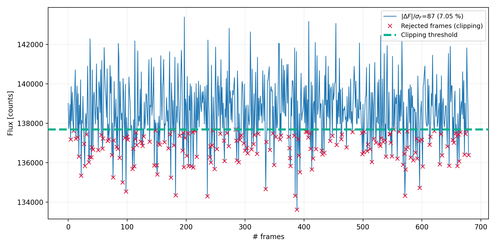 FIG. 2 - Example of integrated flux measurement along the cube (# frames). The rejected frames are labelled by the red cross. The threshold is represented with the green dashed line.