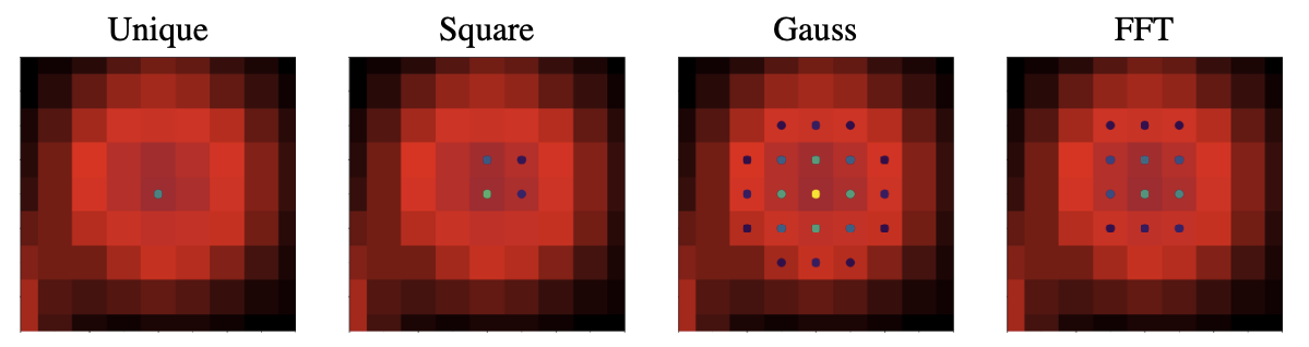 different sampling methods (peakmethod = ('unique', 'square', 'gauss', 'fft'))